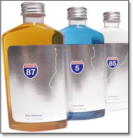 Before you think you're one step away from an aftershave that smells like big rigs and road kill, these all-natural products draw a little more inspiration from the locale than the highway itself, like the "I-87" Adirondacks Shampoo, which leaves you with a clean, mountain fresh scent, the "I-95" New England Scalp Wash, which fortunately gets you cleaner than Manny Ramirez, and the "I-80" Napa Valley Pre-Shave Gel, which does not in fact make you smell like a wino, but rather leaves a soothing relaxed feeling in its wake.