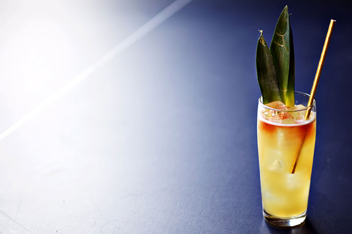 Shake first four ingredients with ice. Strain into a collins glass, top with Angostura bitters and garnish with pineapple leaves.