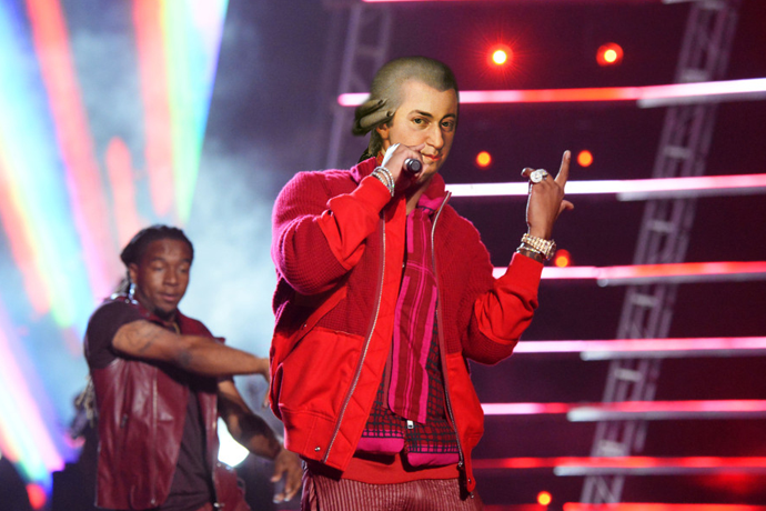 During the VMA’s, delivers a rousing plea for greater acceptance of men in powdered wigs.