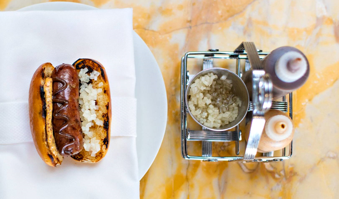 The upgrade: Menton Gold Bar's decadent foie gras frankfurter with condiments like blueberry-walnut ketchup and popcorn mustard in Boston.