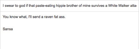 How does Sansa feel about this? Or Jaime and Cersei? Or Citadel dropout Samwell Tarly? Luckily, we discovered a few emails that might shed a little light into how some of these big time players are feeling right now.