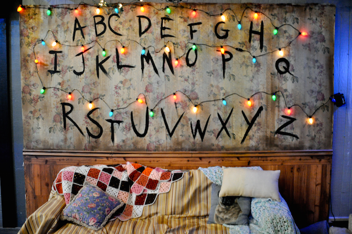Things design elements, like Joyce Byer’s living room wall, strung up with Christmas lights, and